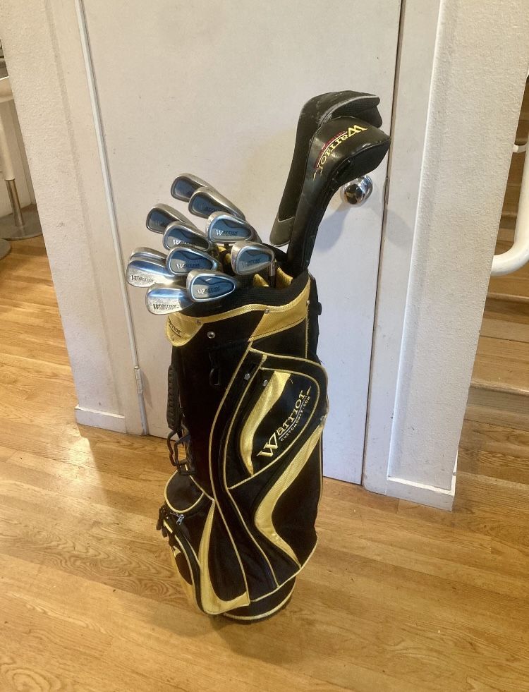 All NEW grips, a 3-Club wedge set, HYBRID-STYLE irons, 14 clubs (max allowed by rule), EVERYTHING IN NICE SHAPE!! This set is a Warrior Golf Set CUSTOM-MADE for a man 5'2"-5'7". The shafts are 1 inch shorter than standard men’s length, perfect for a man of that height! 14 total clubs with BRAND NEW GRIPS & cart bag, all in NICE CONDITION! Getting properly fit for your golf clubs is UNBELIEVEABLY IMPORTANT! Warrior Golf IS-NO-JOKE, they've been selling CUSTOM-MADE golf clubs for decades! ***MY PRICE***$325***No offers please---This is a CUSTOM shorter set in very nice condition w/ NEW grips & good cart bag and will sell for $325. INCLUDES **Warrior 460cc Driver - 10 degrees of loft - Regular Flex Graphite Shaft & Headcover **Warrior 3 Wood - 15 loft - Regular Flex Graphite Shaft & Headcover **Warrior HYBRID-STYLE Irons 3-PW - Regular Flex Graphite Shafts **Warrior Gap Wedge 52 loft - Wedge Flex Steel Shaft **Warrior Sand Wedge 56 loft - Wedge Flex Steel Shaft **Warrior Lob Wedge 60 loft - Wedge Flex Steel Shaft **Warrior Alignment Putter **Warrior Cart Bag I'm a golf pro and I have lots of other golf items including titleist callaway taylormade taylor ping made mizuno cleveland cobra nike scotty cameron and vokey, let me know if there's anything else you are looking for