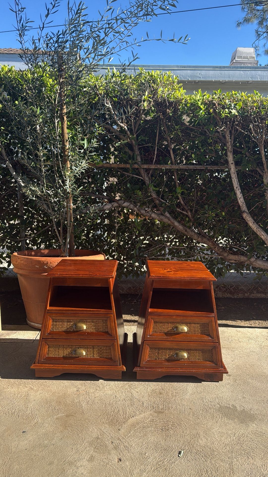 Selling a pair of solid nightstands from pier 1 imports. Completely solid wood no veneer and solid brass pulls. Has nice countertop surface with a bottom shelf for added storage or styling and two drawer for all your belongings. Makes great bedside tables or living-room end tables. In amazing condition. Pickup is in San Fernando (91340) Dimensions: 24 1/2IN Height 22IN Across (the bottom base.) 15 1/2IN Countertop 19IN Depth