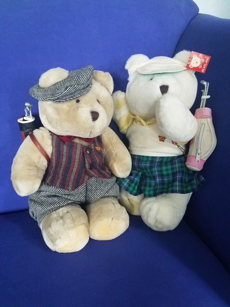 Pair of Golfing Teddies complete with golf bags and clubs. Jointed arms and legs. Dated 1985. Girl Bear has tag at ear... 14" sitting height... Selling on Ebay for $49.50 each...