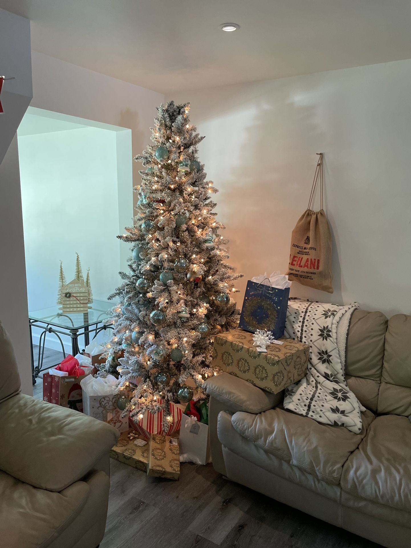 Gently used in perfect condition. Pre-lit flocked Christmas tree, all lights work currently stored in our shed