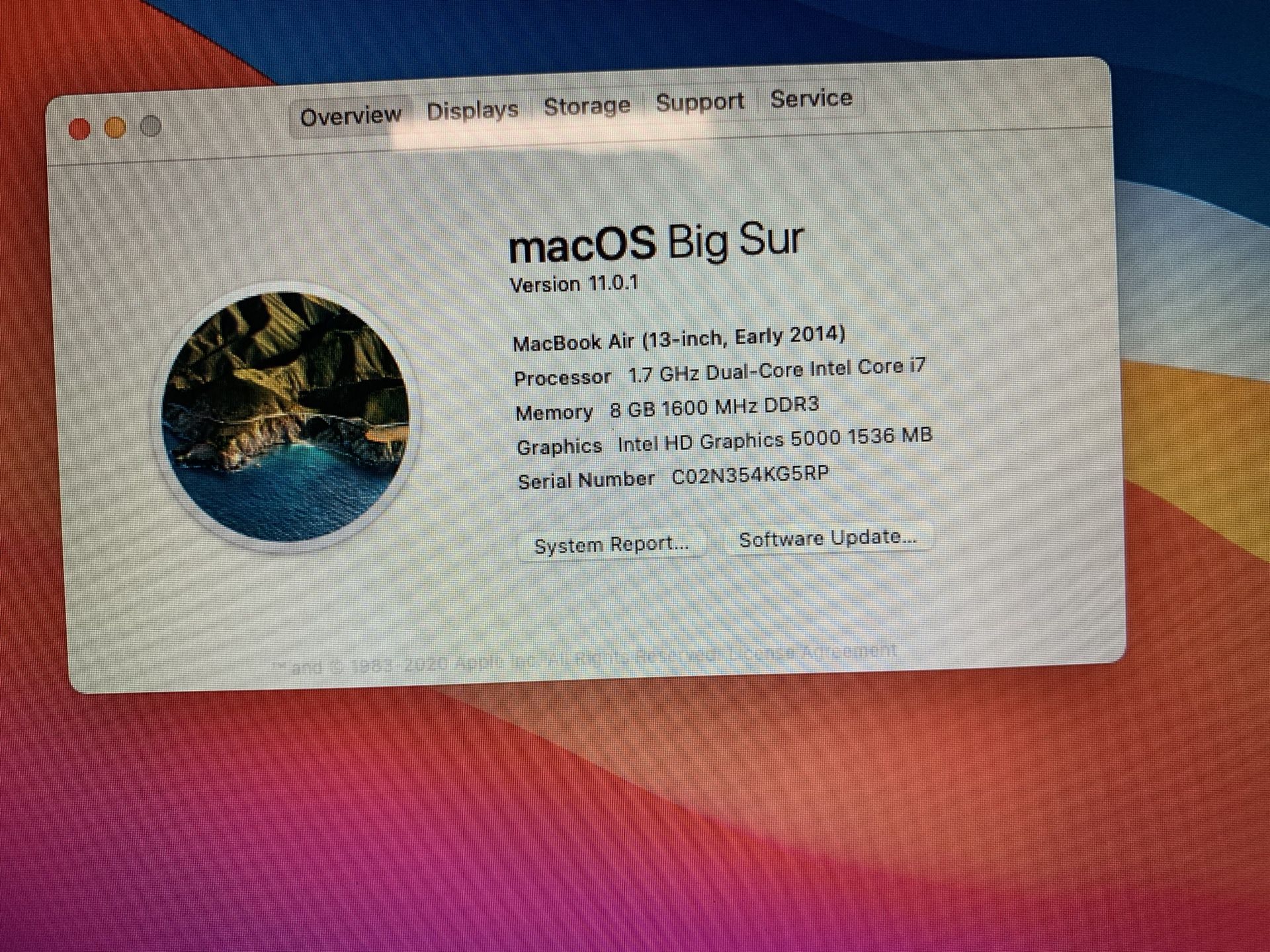 2014 Apple MacBook Air i7 8GB RAM 128GB RAM 13.3” Webcam WiFi Bluetooth macOS Big Sur