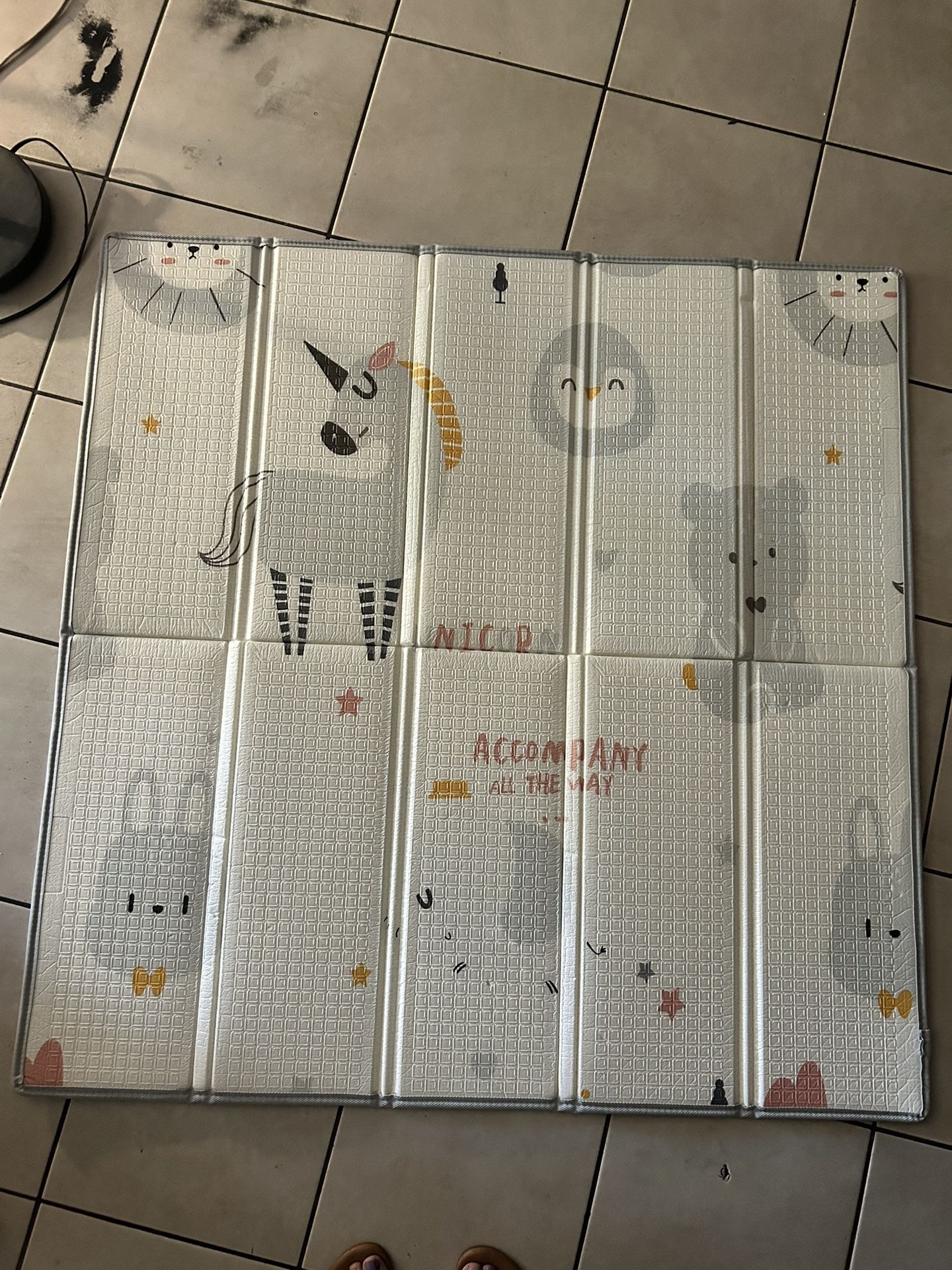 59x59 Foldable & Reversable Large Baby Mat, 0.4" Thick Waterproof Foam Play Mat. Folds up into a nice small piece for compact convenience and easy to travel with. Unfold the mat and place on any surface then WaaaH-LaaaH!!! A nice, clean, and comfy play area for your little one. Fold the mat in half and have the perfect nap time mat!! Super easy to clean. Soap and water work perfect but you can use whatever you’re comfortable with. ** BRAND NEW!! ONLY USED ONCE** pet free smoke free home