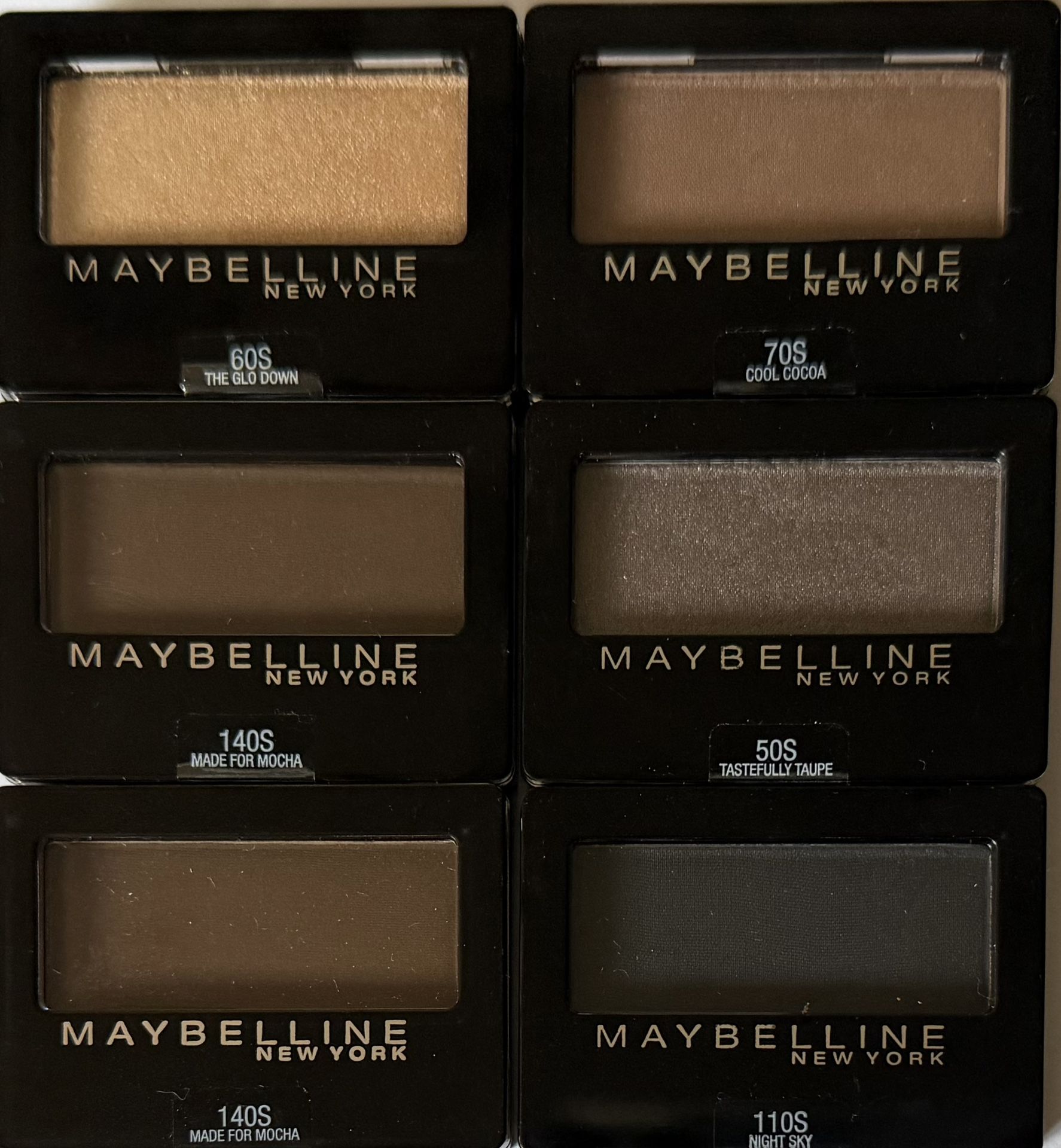 NEW SEALED Maybelline Expert Wear Eye Shadow - $2 Each (Retail Value $5) Create effortless neutral or smoky eye looks with these Maybelline New York Expert Wear Eye Shadows. These smooth, blendable powders are perfect for everyday neutrals or deeper, dramatic eye makeup. Stock up on a versatile mix of matte and glimmering taupes, mochas, and cool tones ideal for building layered smoky eyes or soft, natural looks. Available Shades (2.3 g each): • The Glo Down (2 available) • Cool Cocoa (1 available) • Made for Mocha (2 available) • Tastefully Taupe (3 available) • Night Sky (1 available) Why You’ll Love Them: ✔ Classic smoky-eye friendly neutrals and dark tones ✔ Smooth, buildable powder formula ✔ Easy to blend and layer ✔ Long-wearing color payoff ✔ Great for travel, backup shades, or makeup kits Perfect for makeup lovers, professionals, or anyone looking to stock up on reliable, go-to eye shadows from a trusted brand.