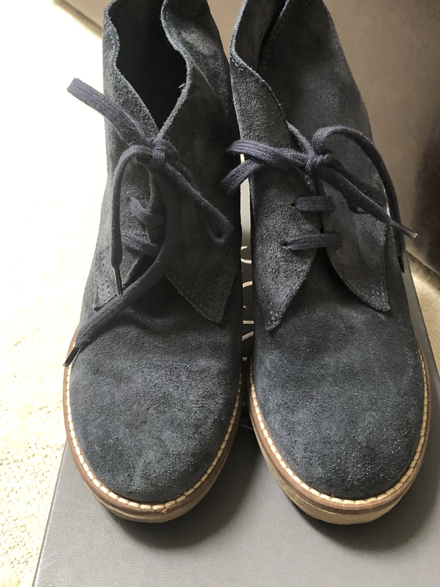 Jcrew high heel Macalister boot in navy suede with navy shoelaces and rubber heels. Very comfortable to walk in.