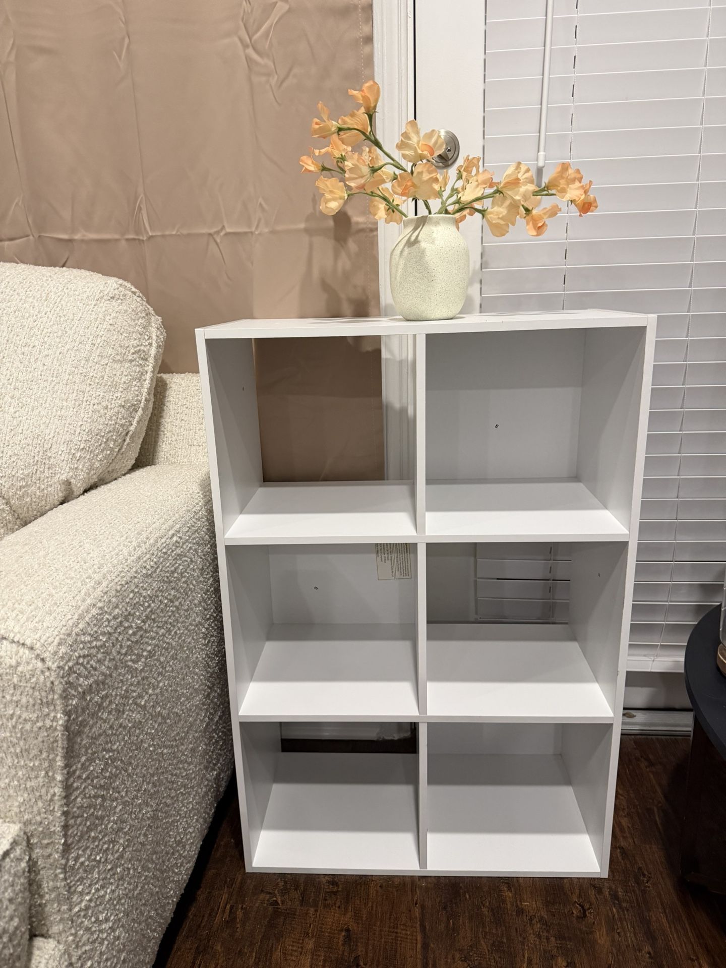 White 6-cube storage organizer/bookshelf. Perfect for books, decor, toys, or storage bins. Works great in living rooms, bedrooms, closets, or playrooms. Clean and in great condition. Very sturdy. Approximate dimensions: 36” H × 24” W × 12” D. Fits standard cube storage bins. Pickup only.