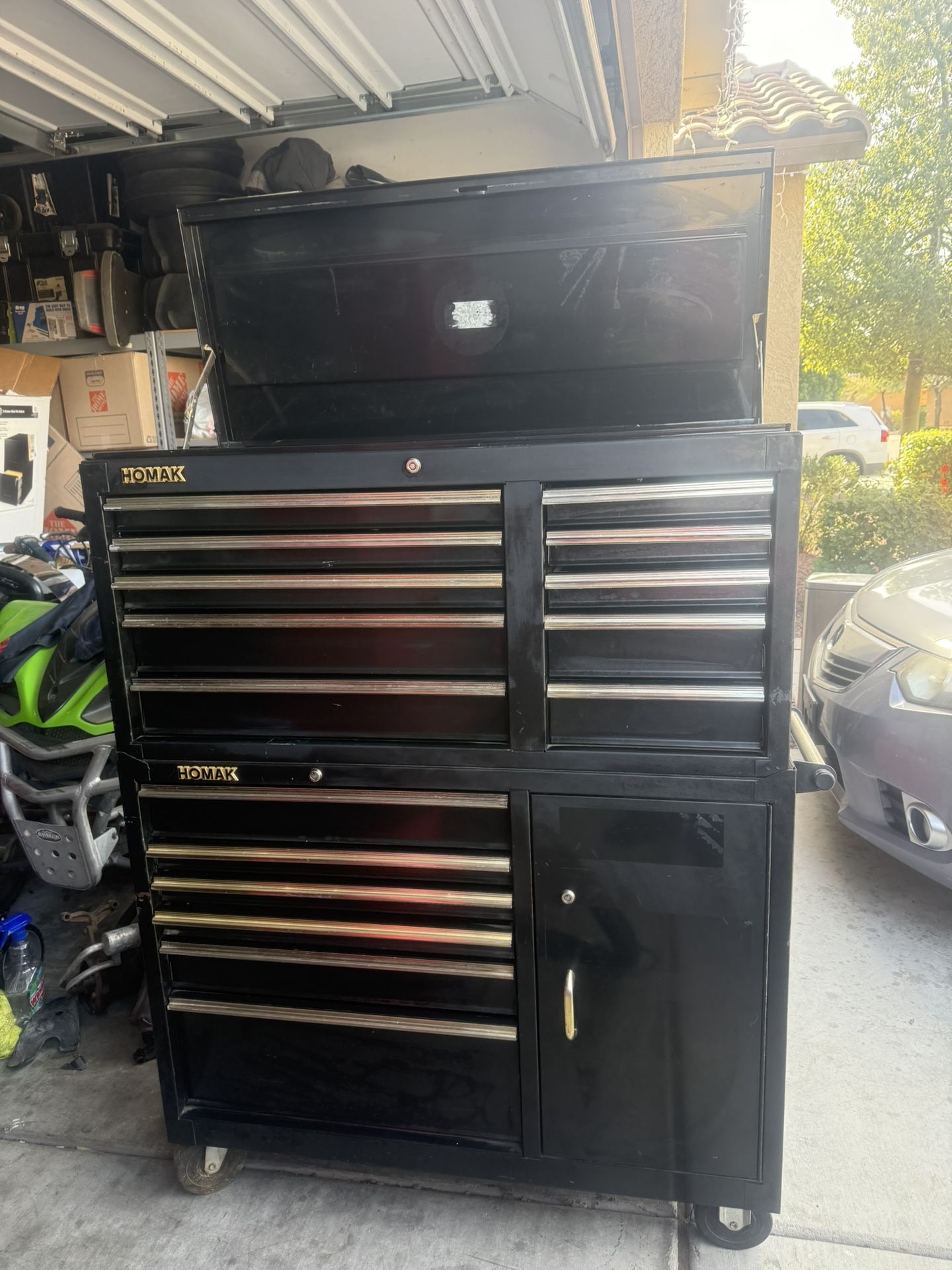 Homak Gold Series 2-tier toolbox featuring 16 pull-out drawers, a cabinet with one door and three interior shelves, plus a top storage compartment with a lid. Includes two sets of keys. Dimensions: 55” H x 41” W x 18” D.