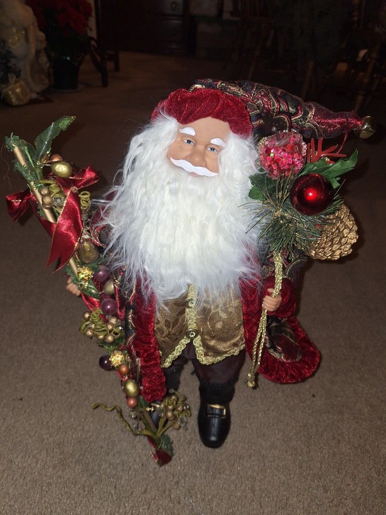 Approximately 18" tall Christmas Santa figurine wearing a colorful burgundy paisley robe, holding a staff. Item is in good condition. Willing to meet in Modesto.
