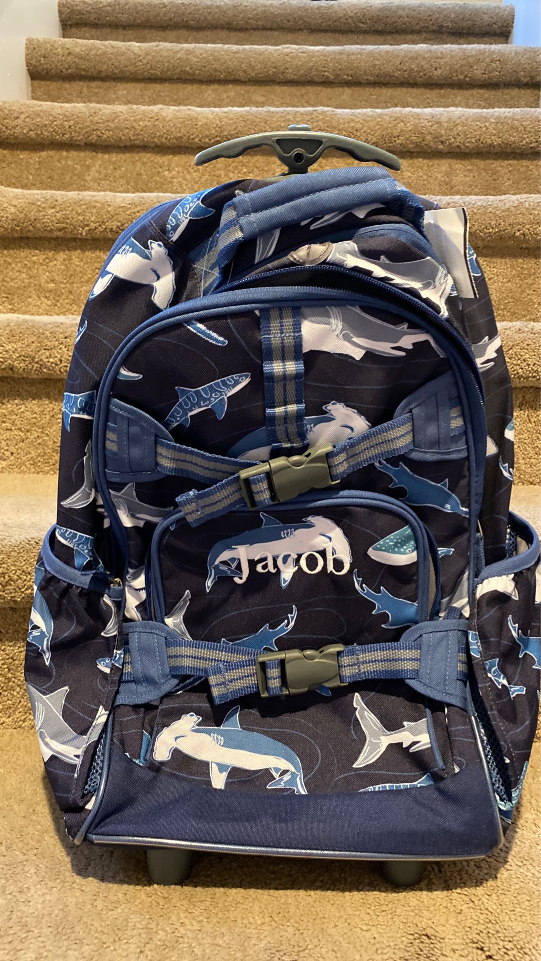 Pottery barn. Rolling backpack in blues. Monogrammed with “Jacob”.