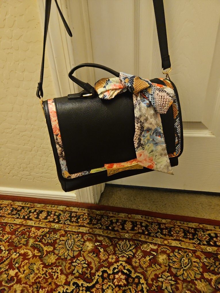 Fairly large betsey johnson crossbody purse Black with cute floral interior Has floral ribbon included with bag (like a bow) Great condition !