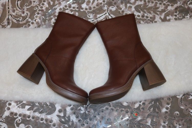 Step out in style with these elegant brown leather mid-calf boots. Perfect for any occasion, they offer both comfort and sophistication. Shaft Height 7.75 inches Heel height 3.5 inches UPC (contact info removed)9 Feel free to ask for any more details