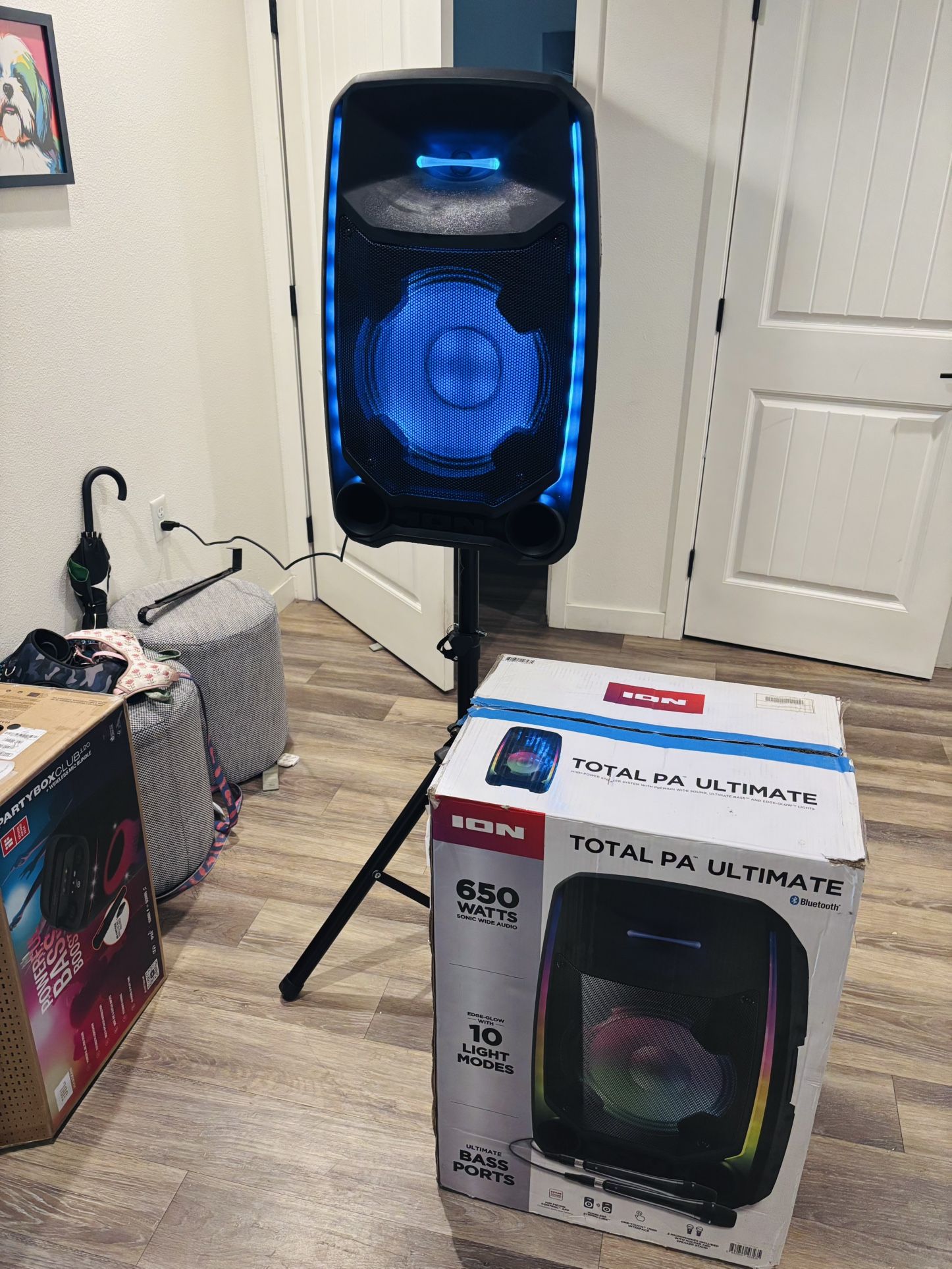 Perfect condition, in box. Available for pick up. Mics , stand and everything included of course . MESSAGE ME IF YOU HAVE QUESTIONS. We speak Spanish as well. FEATURES & SPECSβ π 650 Watts Peak Power β Loud, clear, and distortion-free sound ideal for parties, events, or performances. π 15β Woofer + 1β Tweeter β Full-range sound with deep bass and crisp highs. π Multi-Color LED Lights β Dynamic light show synced to your music. π Bluetooth Streaming β Wirelessly stream from your phone, tablet, or laptop. π One-Touch TWS Link β Connect a second Total PA Ultimate wirelessly for stereo sound. π Included Wired Microphone & Stand β Plug-and-play for instant karaoke or announcements. π USB and SD Card Inputs β Play music directly from flash drives or memory cards. π Telescoping Handle & Wheels β Built-in trolley design for easy transport. π Rugged Cabinet β Durable and built to last with molded construction. π Dimensions: 18.5β x 15.75β x 27.5β | Weight: 39.2 lbs