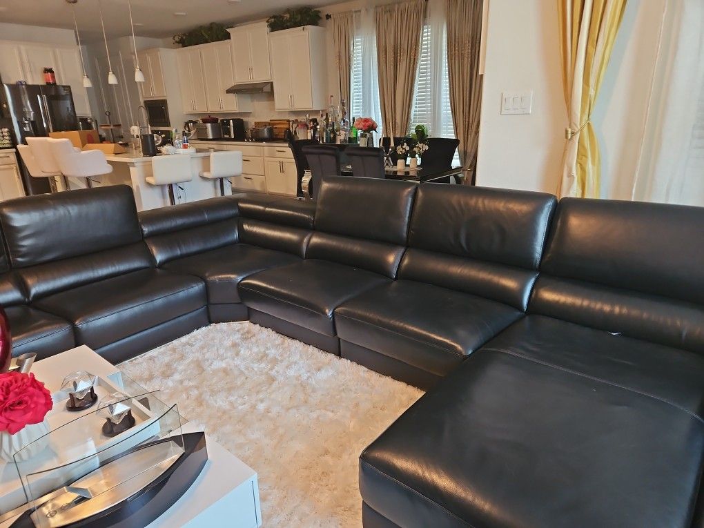 Elegant and Metropolitan, our Wynn sectional in black top grain leather with split leather back and sides will be a bold statement piece you'll own for many years to come. The Wynn's sleek and modular design lets you personally customize any configuration to fit beautifully in your home. Adjustable headrests, extra-wide armrests, and a reversible dining tray/armrest give this piece the ultimate in function and sophistication. Slide forward seats extend an extra six inches for unsurpassed comfort.