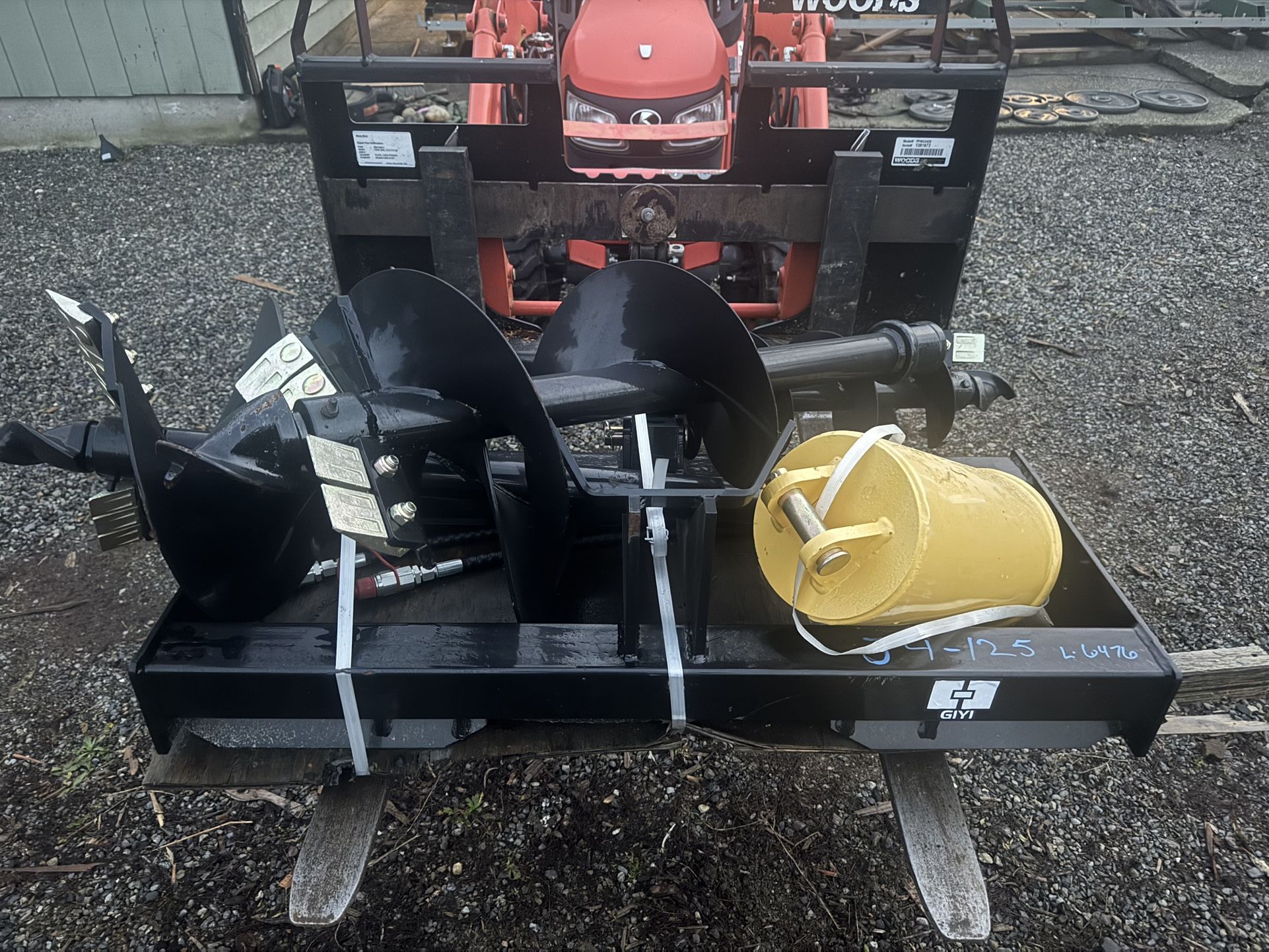 Fits skidsteer Quick Attach Loader Systems 3 Augers Included with Heavy Duty Replaceable Cast Iron Cutters and Cast Center Pilot Bit. I have the smaller version of this unit on my mini excavator and the cutters and center guide wear incredibly well even in Rocky soils and roots. These Hydraulic Drills are The Best way to dig holes this side of a Vac Truck 6” Auger 12” Auger 16” Augers included Square Shaft Drive for Positive power transfer Hydro Hoses Included Standard flow, requires 9-36 gpm and up to 3600 psi Very Nice Set Up I purchased this unit (online) for my mini excavator but this is too big of a Unit for my little mini Bobcat Takeuchi skid steer Kubota John Deere new holland boomer Branson fire wood firewood bucket excavator