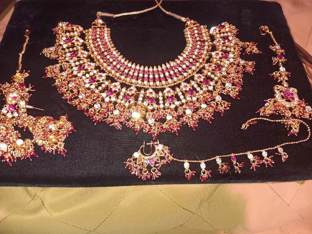 Necklace, earrings, headpiece, and nose piece.