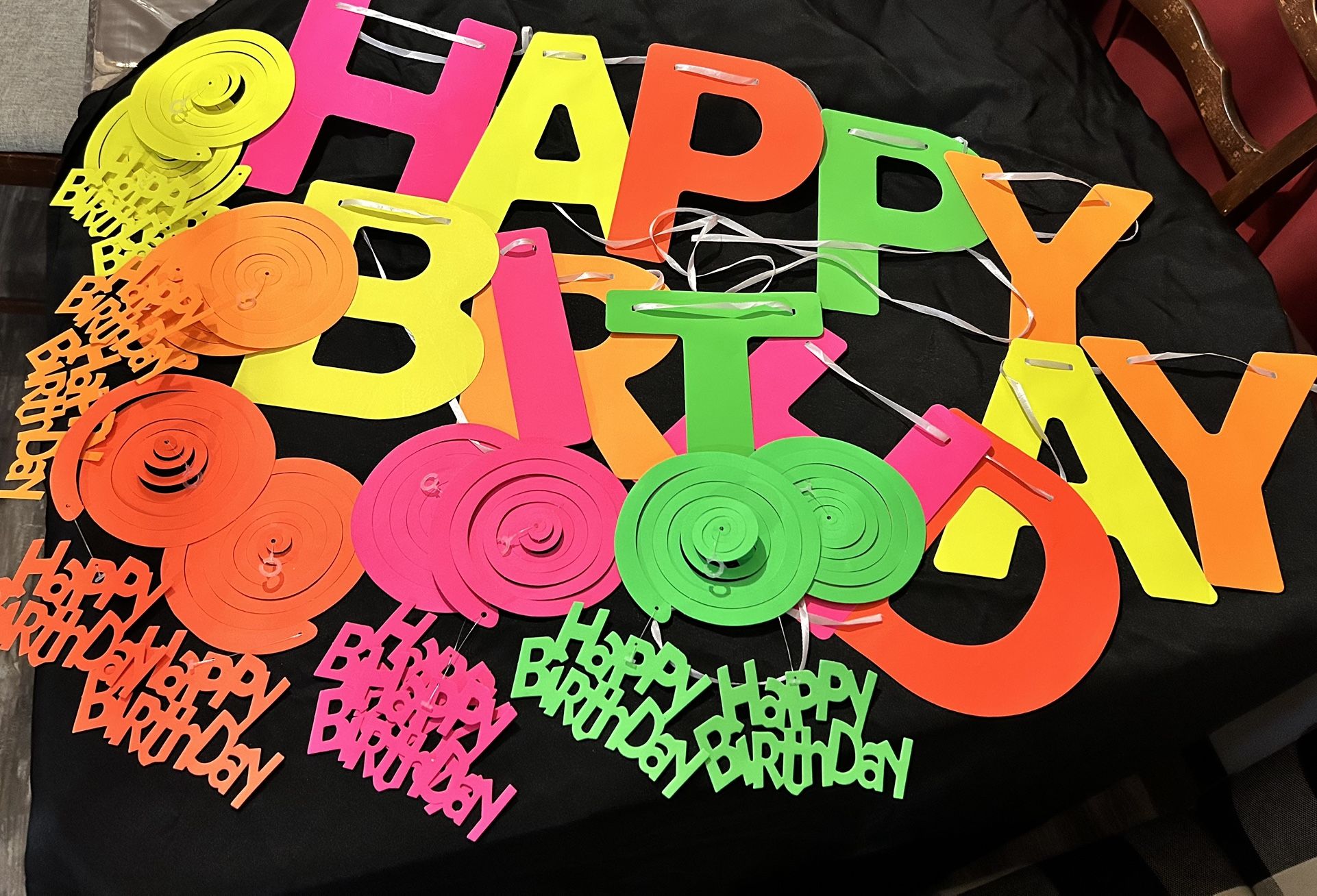 Throw an 80s neon party!!!! Happy Birthday sign Birthday decor swirls Neon splatter plates, dessert plates, and napkins Hot Pink silverware 18 Hot pink candles Light up 80s glasses, they flash fast, slow, or steady!! Neon hoop earrings and scrunchie 10 balloons and assorted glow bracelets
