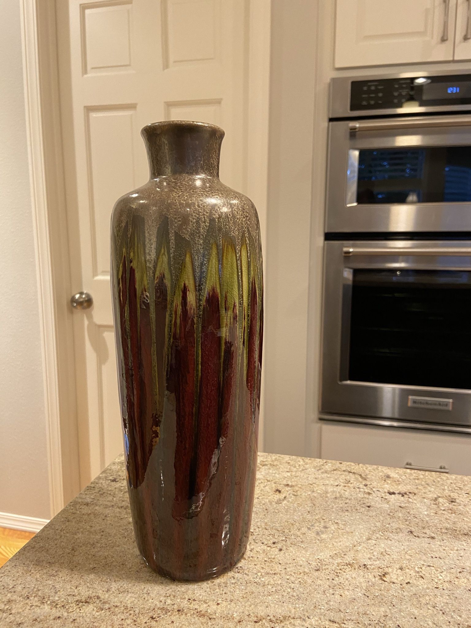 Pier One ceramic reactive vase with art deco Boho Glaze paint. Approximately 13”high with a 2” opening. Mint condition, no blemishes, chips or cracks. Cash only please. Please see my other offers for children’s items from Brio, Graco, Lakeshore, Childcraft and MCM seasonal decor from Pottery Barn, Crate & Barrel, CB2, West Elm, Restoration Hardware and Pier 1