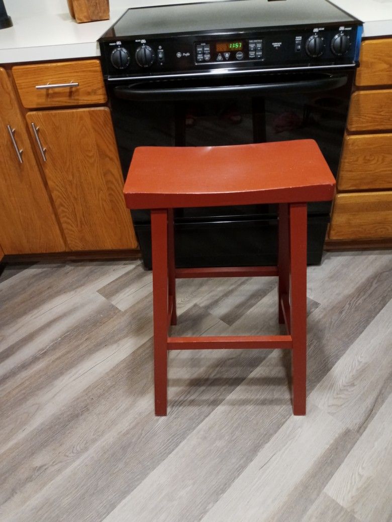 Rust red color bar stool. Seat height, 28.5 in. Seat width, 17.5 in. Seat depth, 9 in. Good used condition.