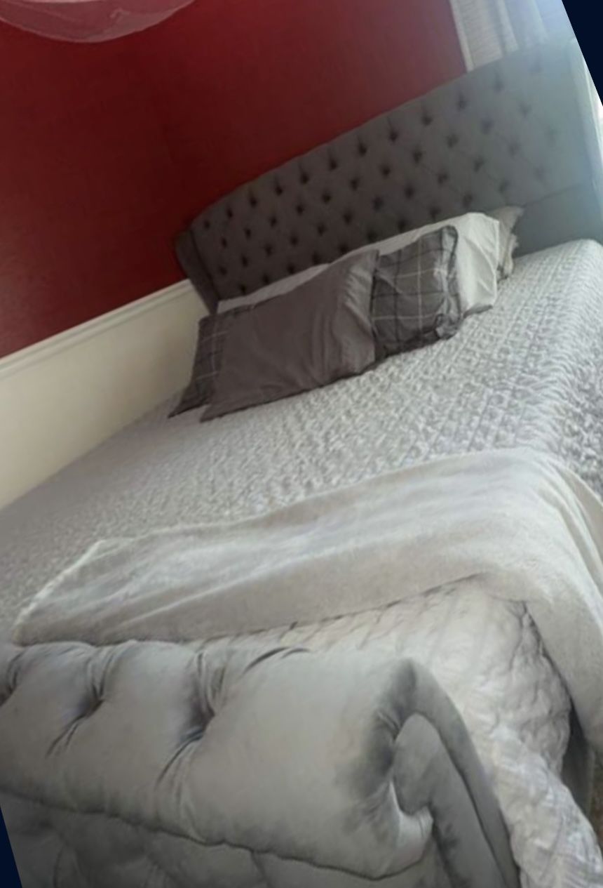 King size bed frame no box spring required in color grey.