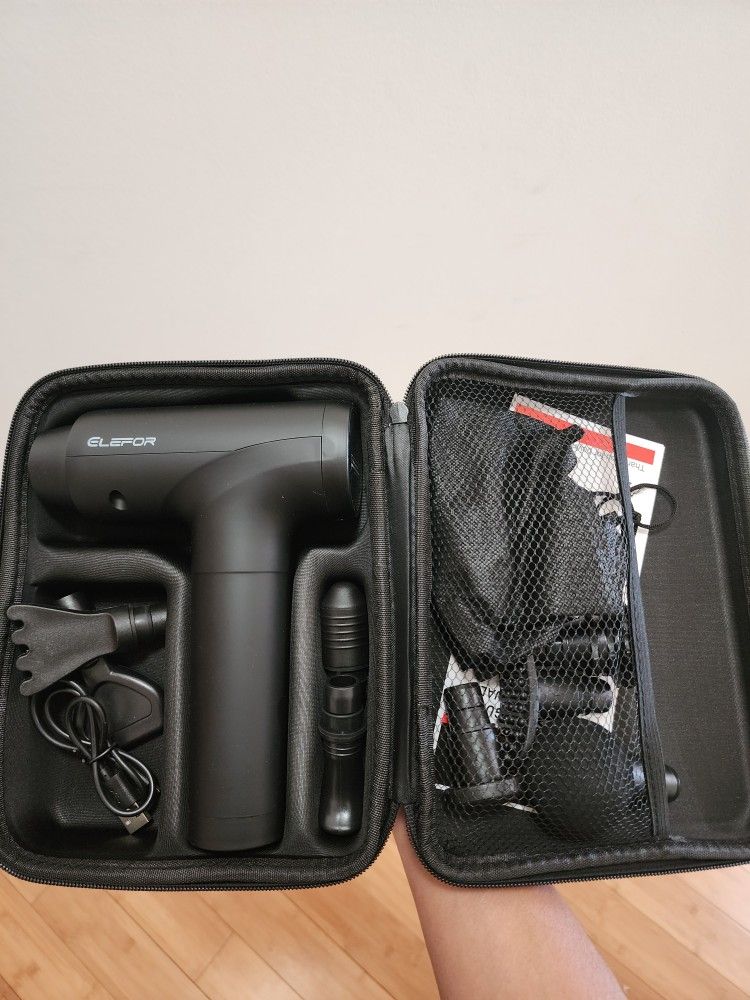 - 10 different massage heads, each of which is aimed at different muscles. - 20 levels of touch LCD touch screen - Ultra quiet - 20 hrs+ battery - Extremely portable and lightweight Unused! Comes with carrying case and all attachments