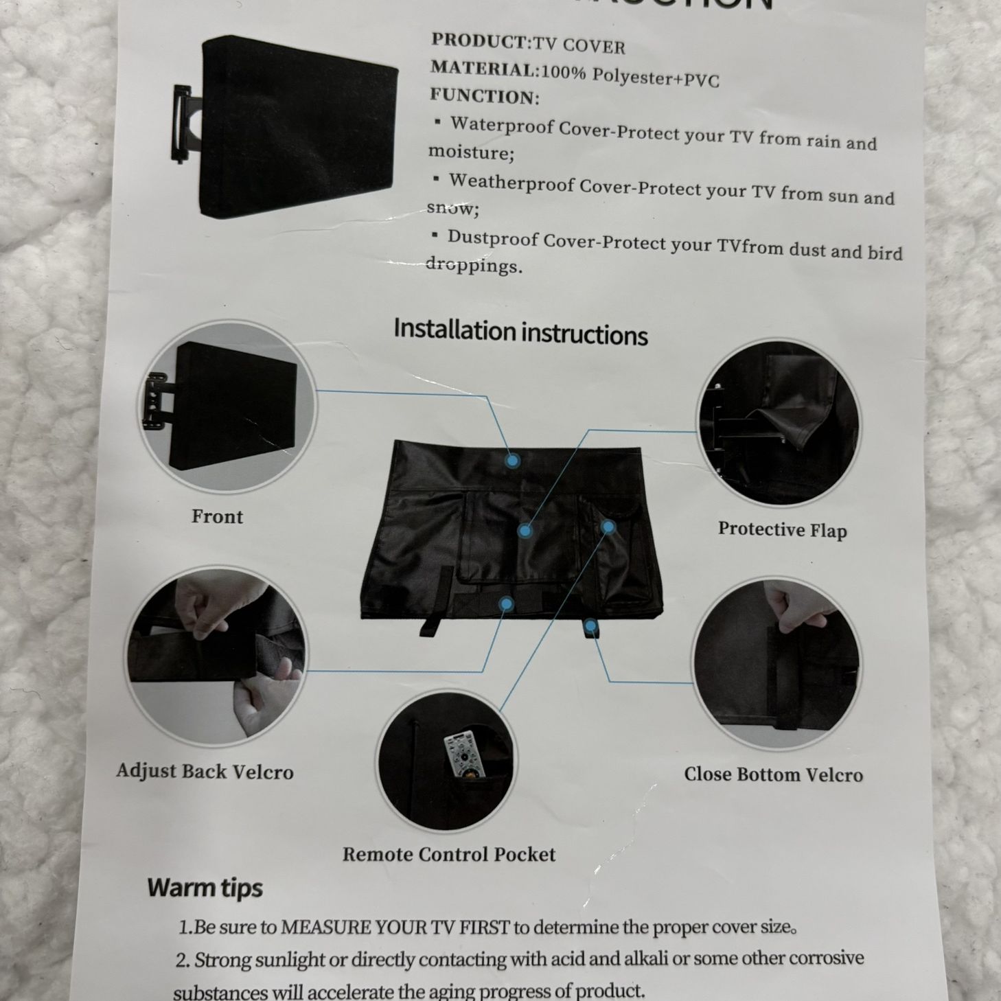 Brand new waterproof TV cover, never used, still in original packaging. Designed to protect your TV from rain, sun, dust, and outdoor debris. Perfect for outdoor patios, covered decks, garages, or spare TVs. Features: ✔️ Waterproof & weatherproof (rain, sun, snow) ✔️ Durable polyester + PVC material ✔️ Soft interior to protect screen ✔️ Adjustable back Velcro straps ✔️ Bottom Velcro closure ✔️ Built-in remote control pocket ✔️ Protective rear flap for cables/mount ✔️With cleaning cloth Color: Black Condition: New Installation: Easy slip-on with Velcro (instructions included) Size: 32 inch