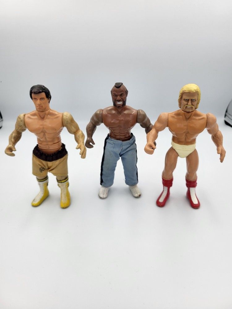 Rocky, Mr. T, and Hulk Hogan action figures from Rocky 3 movie.