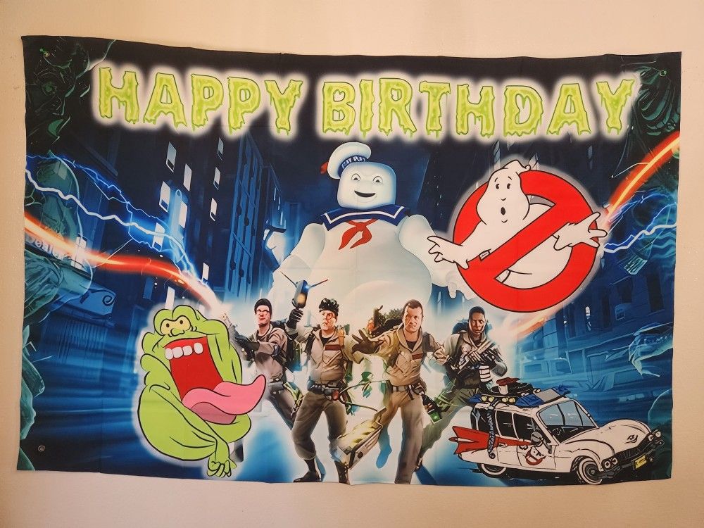 Ghostbusters birthday $20 Backdrop 4'10 x3'3 Cake Topper π Cupcake Toppers π§ Balloons π 1 Table cover 1 pk of dessert plates sm Napkins Cups Utensils Box.11