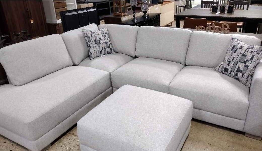 This large chaise sectional with ottoman features a modern profile, with square arms, widGray Fabric Sectional With Ottoman (NEW )e feet, and generous proportions creating the perfect lounging space for any family room. The gray fabric adorns the entire sectional, while high-density foam and pocketed coils enhance your seating comfort. The ottoman can be moved the location of your choosing, creating a tailored-to-your-space piece. Two throw pillows accent the neutral fabric and provide just the right amount of “pop” to your room. Each piece is supported by solid wood feet finished in a light coastal tone. This modern sectional will be everyone's favorite seat in the house.LAF Chaise: 85.8" L x 38.6" W x 33.5" H LAF Loveseat: 72.4" L x 38.6" W x 33.5" H Ottoman: 32.3" L x 32.3" W x 18.9" H