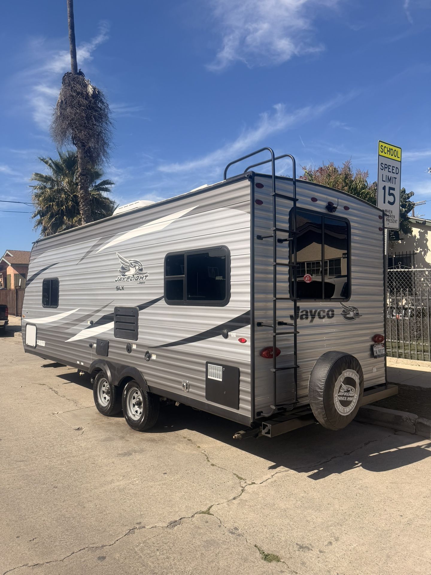 UP FOR SALE ITS MY CLEAN JAYCO JAYFLIGHT 21FT BOX RV TRAVEL TRAILER IN GOOD CONDITION, EVERYTHING WORKS GOOD. PERFECT FOR SOMEONE LOOKING FOR A PLACE TO LIVE IN OR TO GO CAMPING. WITH FULL KITCHEN AND BATHROOM WITH TUB/SHOWER. SLEEPS 2-5, QUEEN BED UPFRONT, COUCH ALSO TURNS TO A BED. A/C, HEATER, ELECTRIC AWNING AND JACK, HITCH AND DISTRIBUTION BARS, BACK UP TRAILER CAMERA. TRAILER IS READY TO GO AND NEEDS NOTHING, TAGS UP TO DATE, TITLE IN HAND. SERIOUS BUYERS ONLY, NO LOW BALLERS!! NO TRADES NO LEAKS THANKS FOR LOOKING