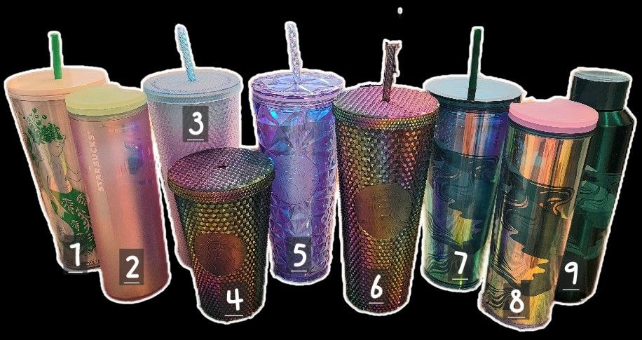 All Tumblers are in great condition lightly used! If all tumblers are bought together you get a free 2025 Christmas Starbucks Red Cup as a "Thank you" 💖✨️ *local pickup + cash only* Each Tumbler has an individual price. Sets are priced lower when bought together. Everything bought together is $55! 1: $ 12 2: $ 8 3: $ 12 5: $ 12 Set 1 (tumbler 4+6) 4: $ 15 *missing straw* 6: $ 20 [Bought together $25] Set 2 (tumblers 7-9) 7: $ 10 8: $ 8 9: $ 6 [Bought together $17] Message me if interested :)!