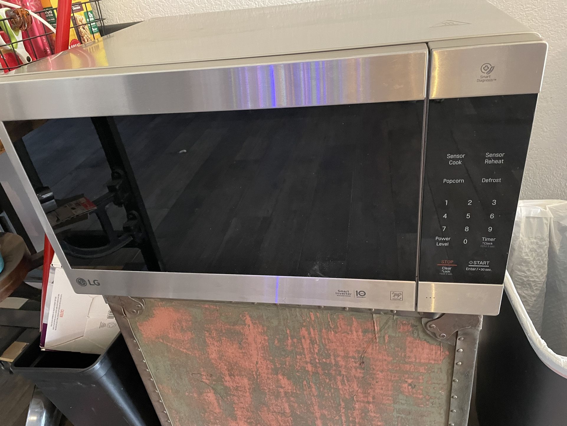 About 3 years old and works perfectly with no scratches or dents. We remodeled our kitchen and no longer have need of this. Sensor cooking and features searchable through model number LMC2075ST. Dimensions in photos. Originally $219