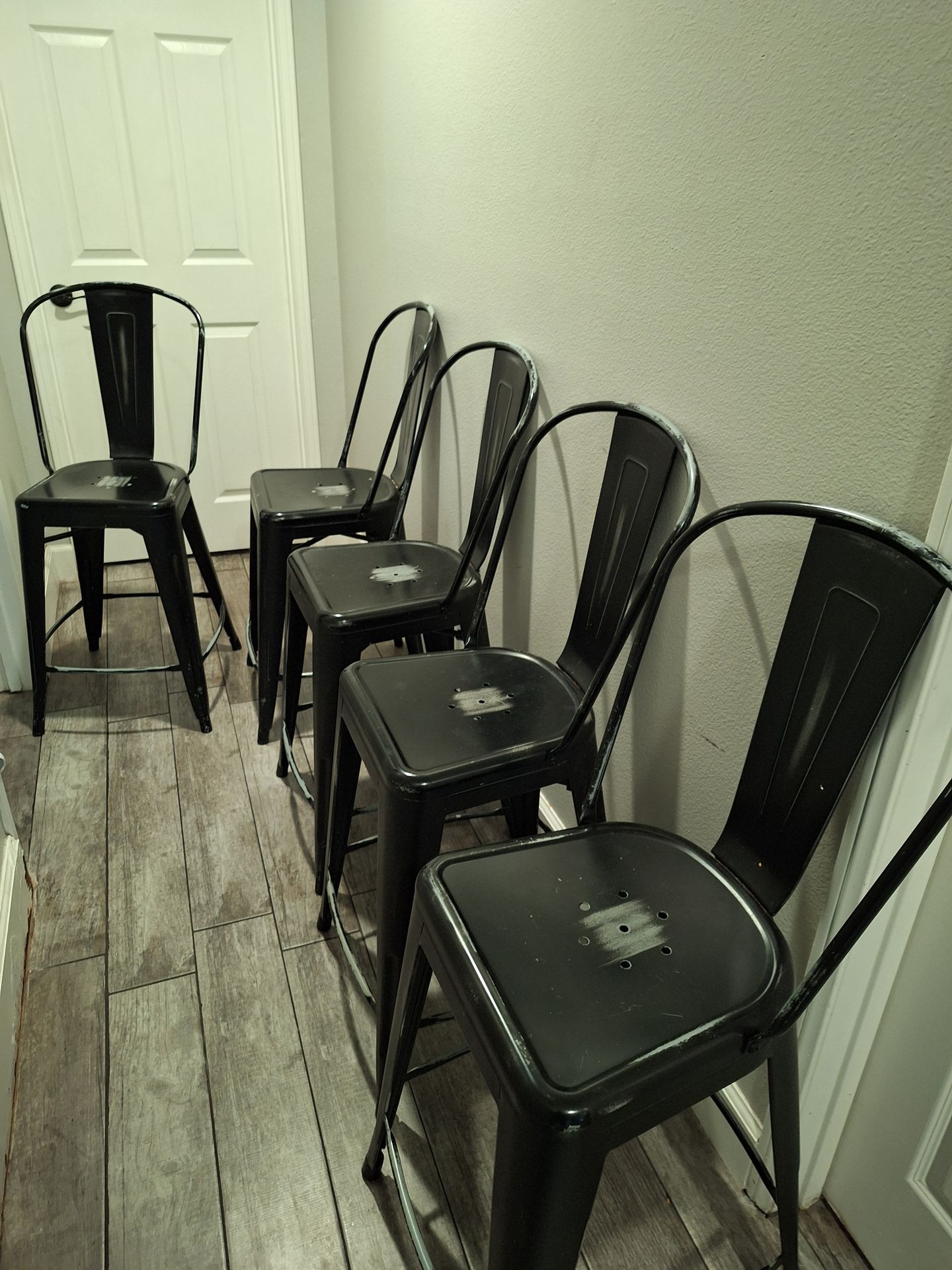 5 black metal bar height chairs for your kitchen island in good condition. They are solid and stable.