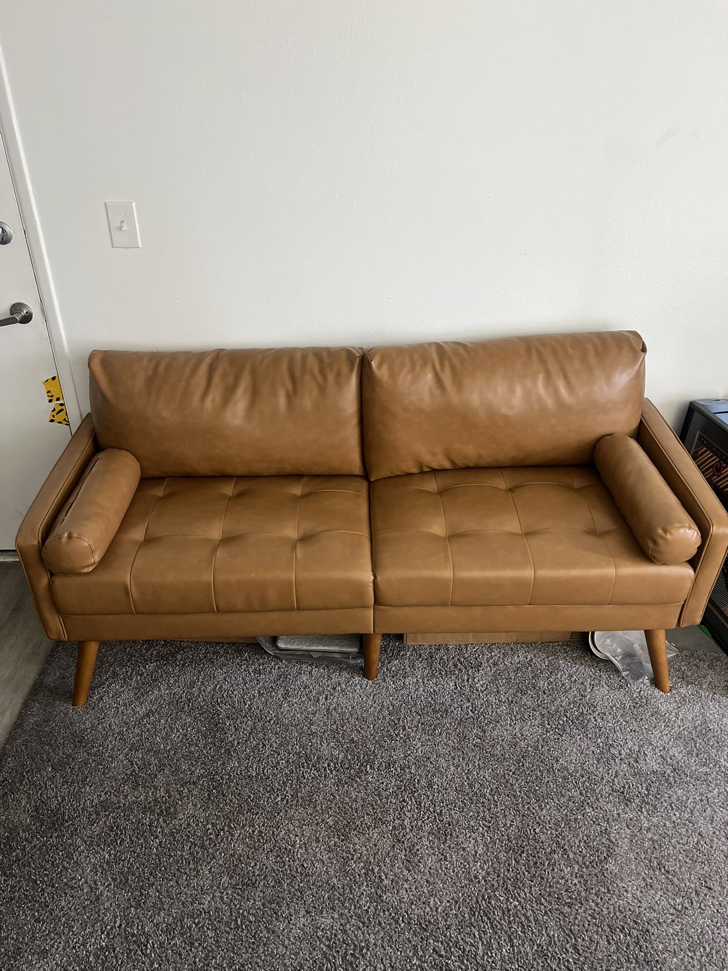 Brown leather couch for sale! Detachable pillows that make it comfortable for people to sleep on. 1/6 legs is broken but still stands up right and is sturdy if positioned properly. Pick up only!