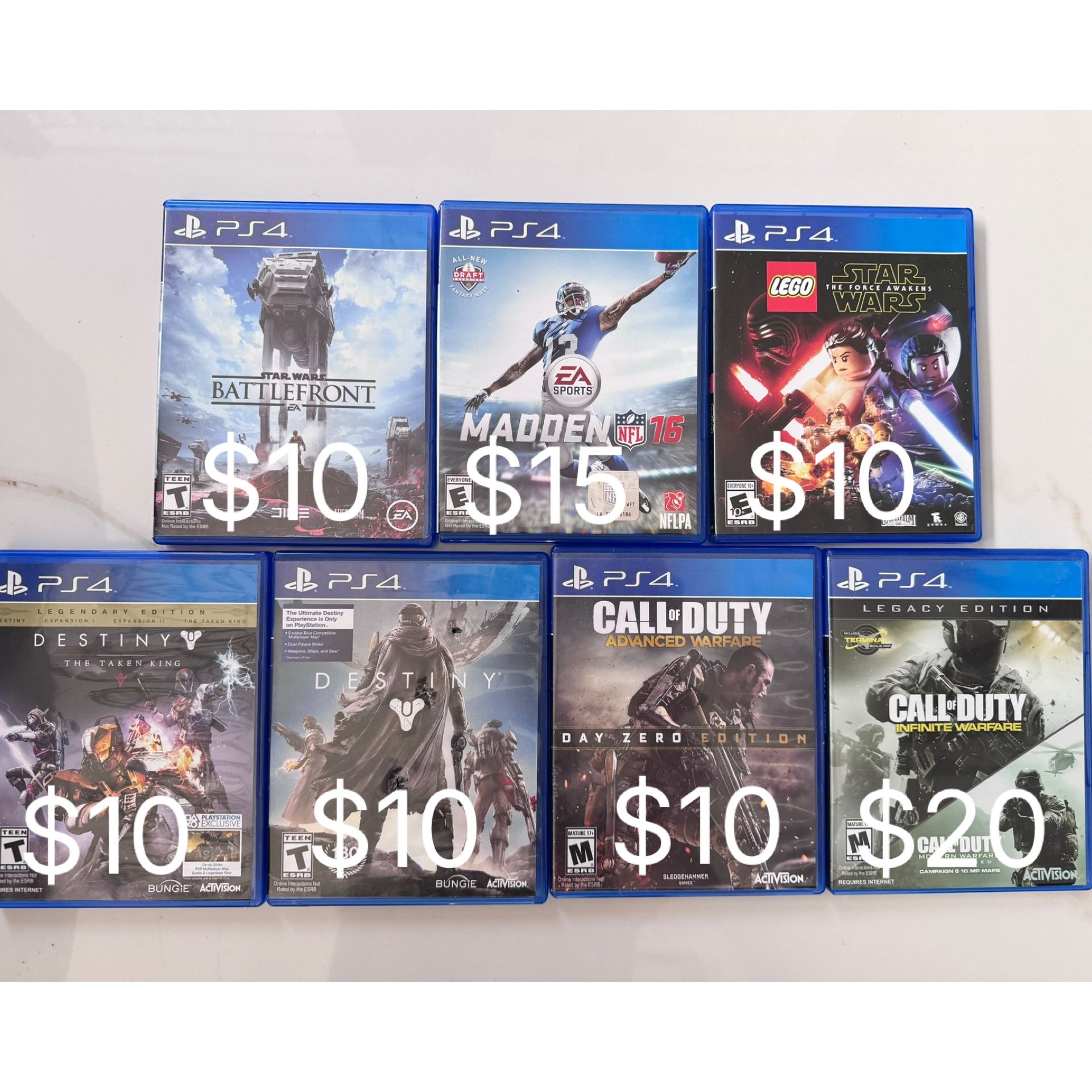 Lof of 7 PS4 Games: *Star Wars Battlefront *NFL Madden 16 *LEGO Star Wars The Force Awakens *Destiny (Note: Box is damaged, game has NO DAMAGE or scratches/LIKE NEW -see last 3 photos) *Destiny: The Taken King (Legendary Edition) *Call of Duty Advanced Warfare (Day Zero Edition) *Call of Duty Infinite Warfare (Legacy Edition) Carefully inspected with no visible scratches and LIKE NEW as pictured. More photos can be provided. $85 (or OBO) for all 7 shown or sold separately as priced. Pick up in North County SD and cash only. Thanks for your interest!