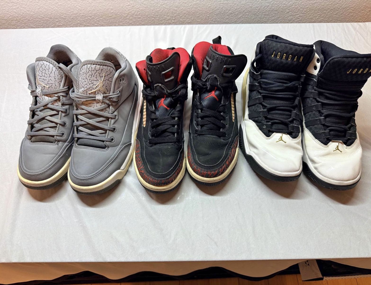The Jordan 6Y sneakers cost 3 for $50. Nike Jordan Flight Origin 3 in a grey colorway. Nike Air Jordan Spizike sneakers in a black, varsity red, and white colorway. Nike Air Jordan Max Aura 'White Black Gold