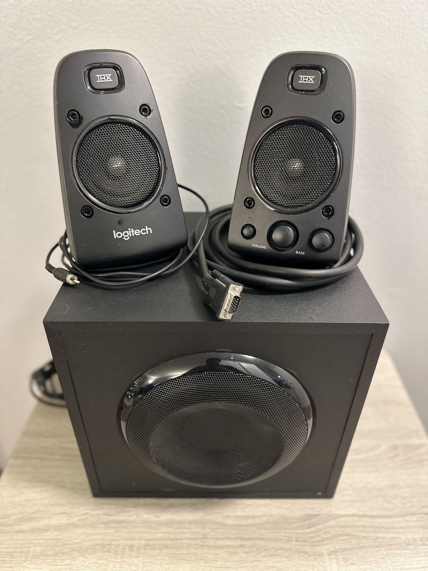 Pre-Owned Unit. Lightly Used! Amazing Condition! https://offerup.com/redirect/?o=aHR0cHM6Ly93d3cubG9naXRlY2guY29tL2VuLWFlL3Nob3AvcC96NjIzLXNwZWFrZXItc3lzdGVtLXRoeA== — The Logitech Z623 Speaker System with Subwoofer is a THX-certified 2.1 audio setup designed to deliver studio-quality audio for music, movies, and gaming. Boasting 200 watts of RMS power and a peak of 400 watts, this system provides immersive, theater-like sound with a specific focus on deep, thunderous bass generated by its powerful 130-watt subwoofer. The system features flexible connectivity options, allowing users to plug in up to three devices simultaneously via RCA and 3.5mm inputs without the need to switch cables. Integrated controls are conveniently located on the right satellite speaker, offering easy access to power, volume, and bass adjustments, along with a built-in headphone jack for private listening. With its robust industrial design and high-fidelity output, the Z623 serves as a dynamic centerpiece for any home entertainment center or desktop setup.
