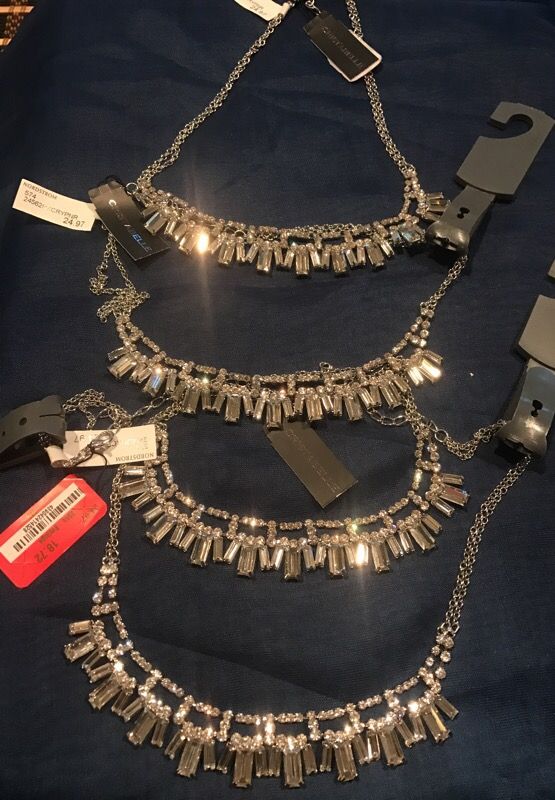 Beautiful crystal necklaces, purchased from the Rack. Was suppose to be bridesmaid gifts for my girls but never got placed in their bags and my wedding day has come and gone. Purchased for $18, since they are brand new, I am willing to depart at the same price. Selling all 4 together $18 each/ $72 for all. These sparkling beauties would be the perfect for bridesmaids gifts to complete their outfits.