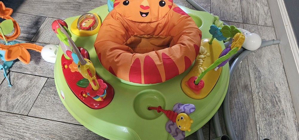 Open box brand new. My husband threw the box away but its clean and new. I set it up but baby preferred walker instead. Never used.