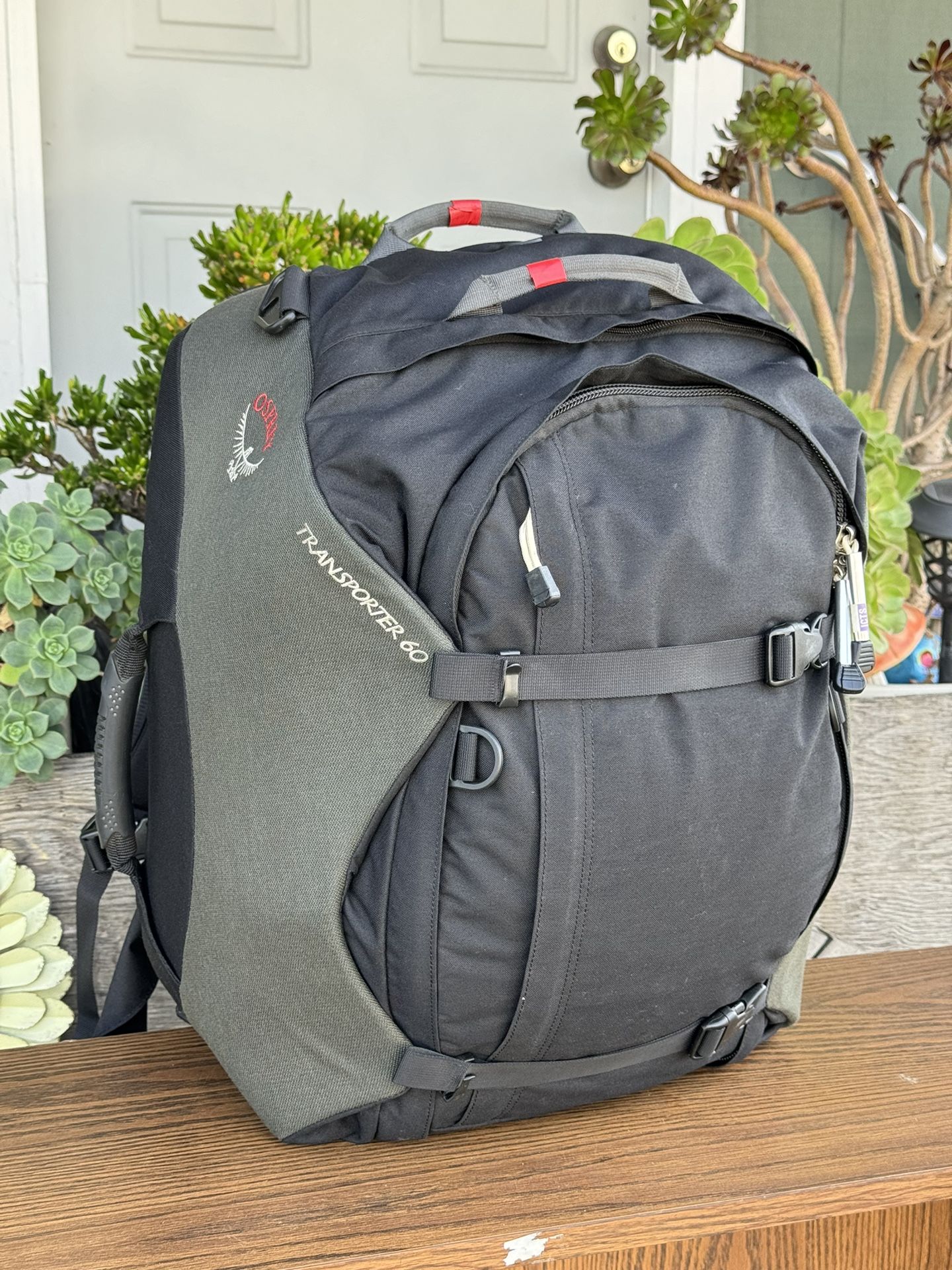 VTG Osprey Transporter 60 Porter Pack - Backpack Green Black. Excellent condition, very nice and super ergonomic. Available for in person purchase at The Thrift Shop Village in Hayward, Ca.