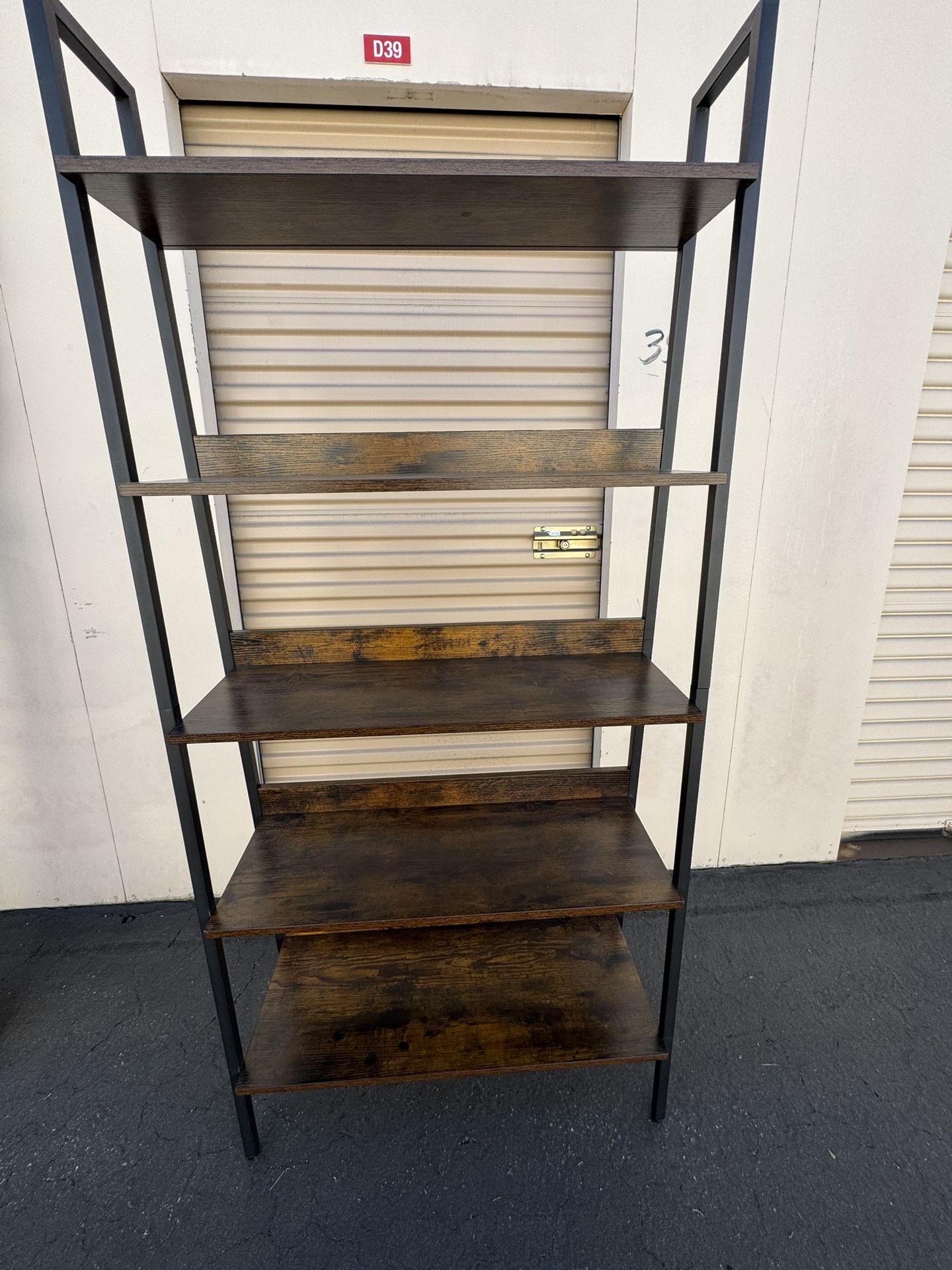 Dark Walnut Ladder shelving unit. Great for small spaces. Measurements: 31.5” wd x 67.5” ht. Top shelf is 8.5” dp, bottom shelf is 12.5” dp. Like New.