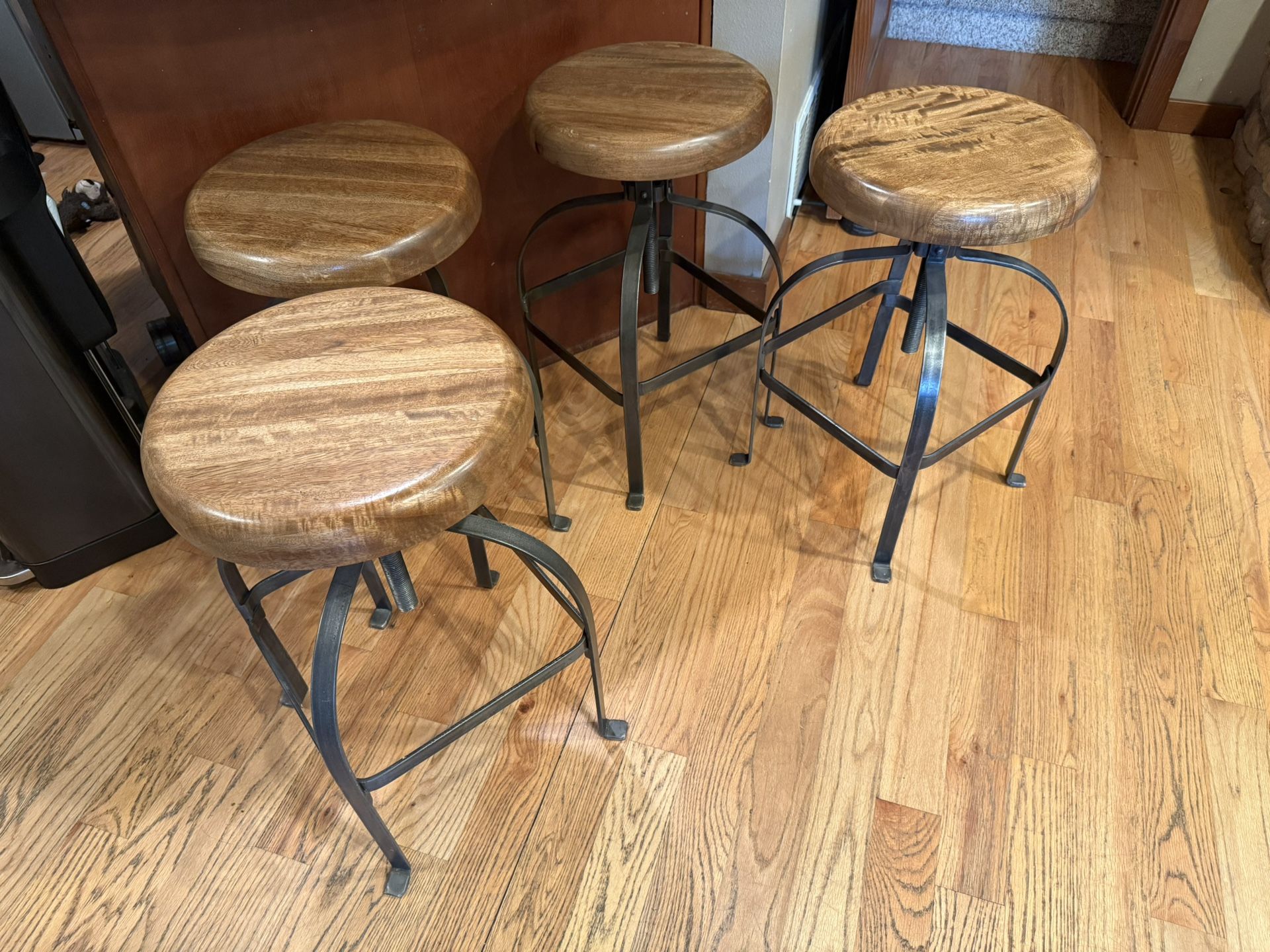 Original cost is $125 each $200 for all 4 stools. Open to selling separately. Dimensions Overall: 14"Dia. x 24.5"-29.75"H, 18.59 lbs. Seat: 14"Dia. Specifications Made of mango wood with distressed finish and iron Height adjusts 5.25" Due to natural materials, slight variations may occur Wipe clean with a dry cloth