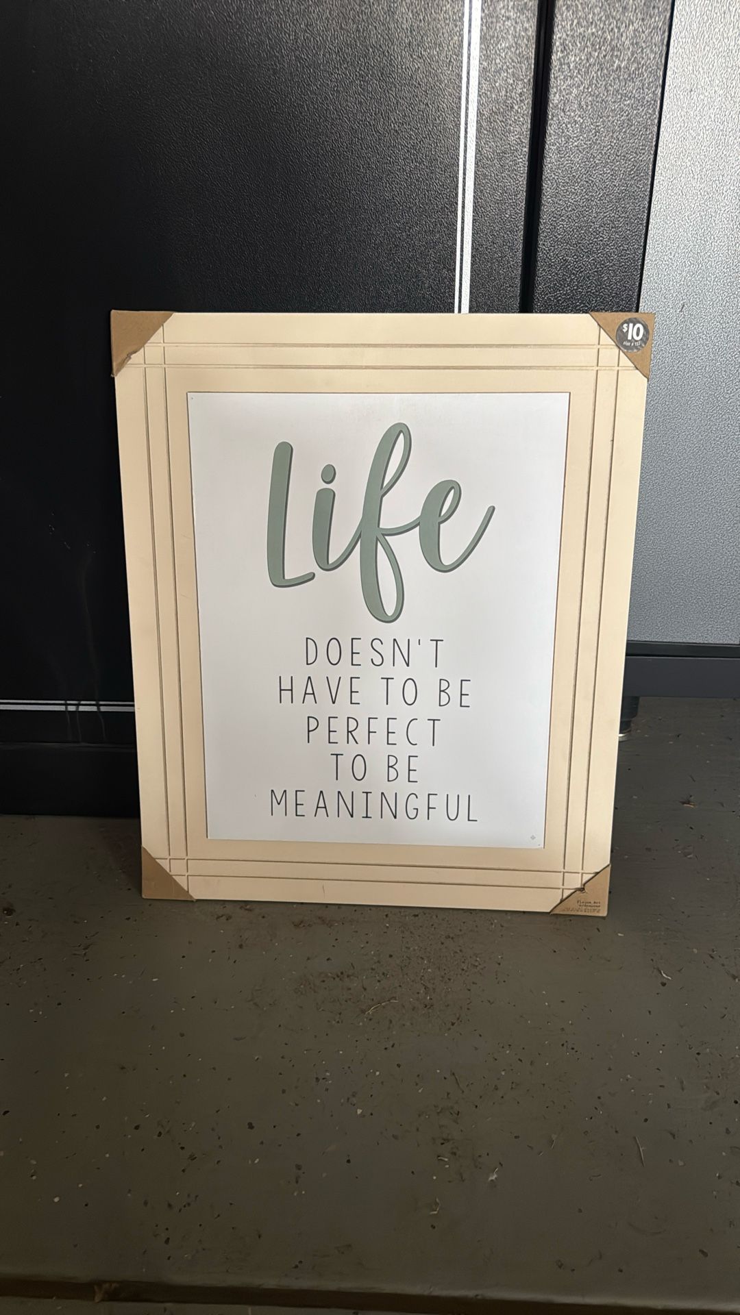 Life doesn’t have to be perfect to be meaningful Vanilla color light wood frame 20 wide 23 tall