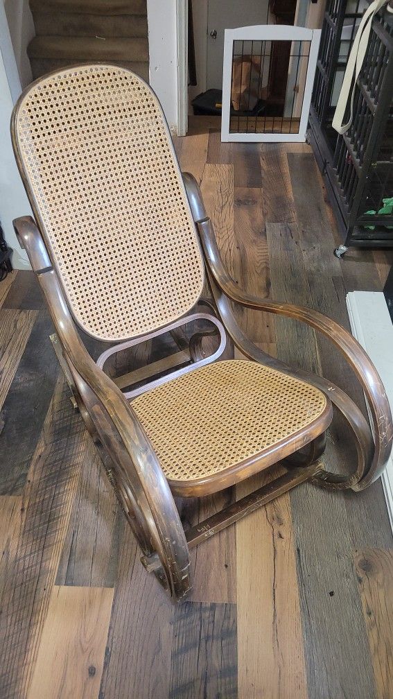 Bentwood Cane Back Rocking Chair, bought used, selling used. Loved and valued as vintage/retro. It is likely dating back to the mid-20th century. These chairs are known for their distinctive curved frames made from steam-bent wood and woven cane seats and backrests. Here's some helpful information: Design: Characterized by rounded wood bends, creating a unique and elegant shape. Material: Constructed from steam-bent beechwood or birch with a cane seat and back. Style: Often attributed to the style of Michael Thonet, a pioneer in bentwood furniture. Origin: Many were manufactured in Europe, particularly in Poland and Italy. Value: Rounded bend models are generally more valuable than those with flatter bends. Maintenance: The cane can be delicate and may require repair or replacement over time. Variations: Some models feature tear-shaped rocker treads or other design variations. Collectibility: Bentwood rocking chairs remain popular among collectors and enthusiasts of vintage furniture.