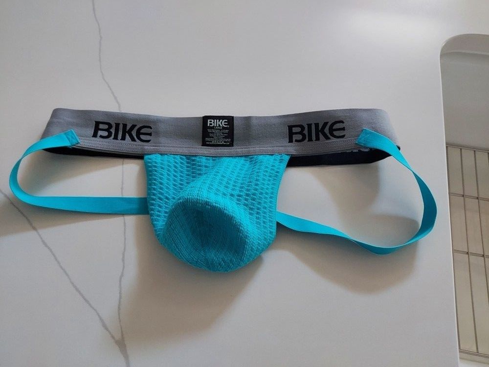 New bike jock in sky blue. It's too big for me. The size is large. Brand new.