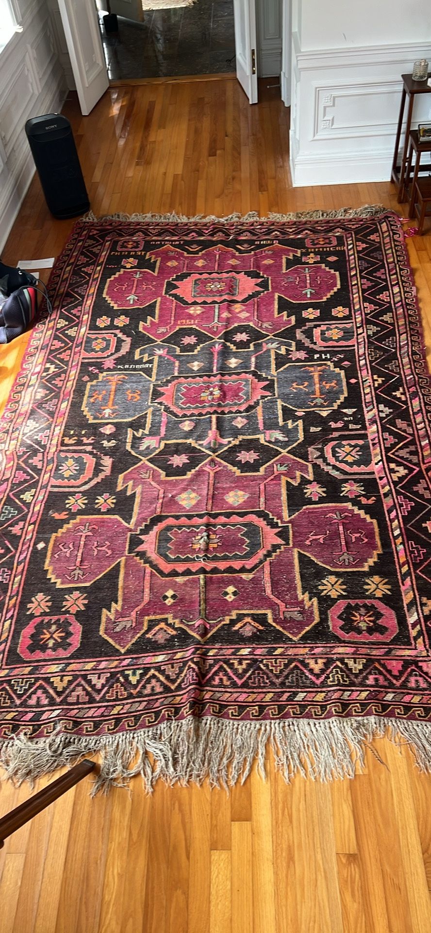 Turn brightness all the way up on phone for accurate colors shown on rug. The text "1961 г" (1961 year) is present on the rug, indicating the year of its creation. Other text elements include "калинат" and "PH." This rug still has original fringe which is rare. Rug style: Anatolian,Flatweave,Kilim,Turkish Its a one-of-kind piece and an amazing deal. All the research we have done show these are worth thousands. i can't find one with original fringe or with text on rug. Last photos show back of rug and original handmade “tag” on bottom but its hard to make out. Size: * WITHOUT FRINGE* 79.5’’x 120’’m (6.62 feet x 10 feet) * WITH FRINGE *79.5’’ x 130.5’’ (6.62 feet x 10.83 feet) If the listing is up then its available. i will NOT respond to messages asking if it's available