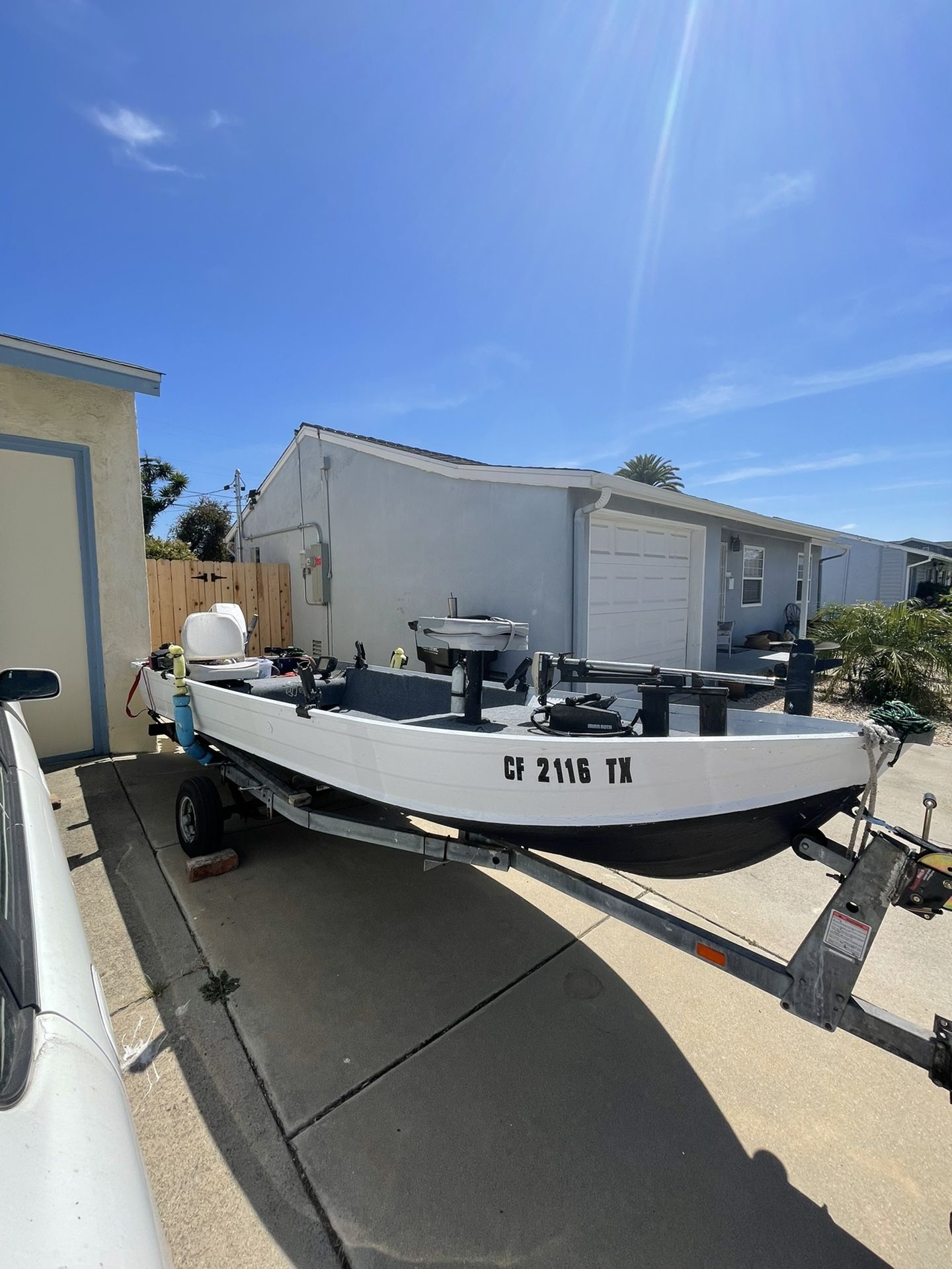 Fishing boat. No leaks, no holes, rod holders, new carpet, freshly painted. Trolling motor 6Hp Evinrude engine. Title on hand for boat and trailer. Registration up to date.