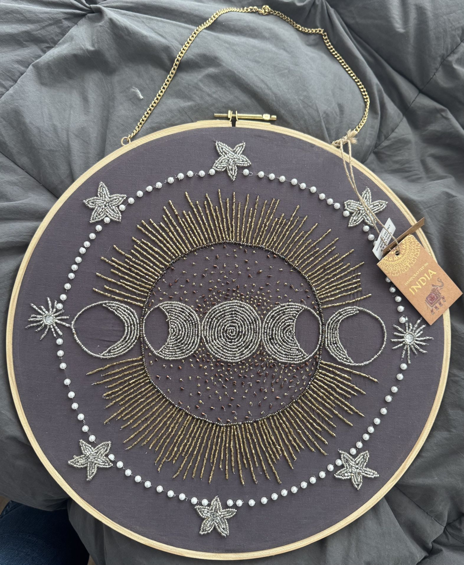 Handcrafted Celestial Sun and Moon Large Beaded Embroidery Hoop Hanging Wall Art