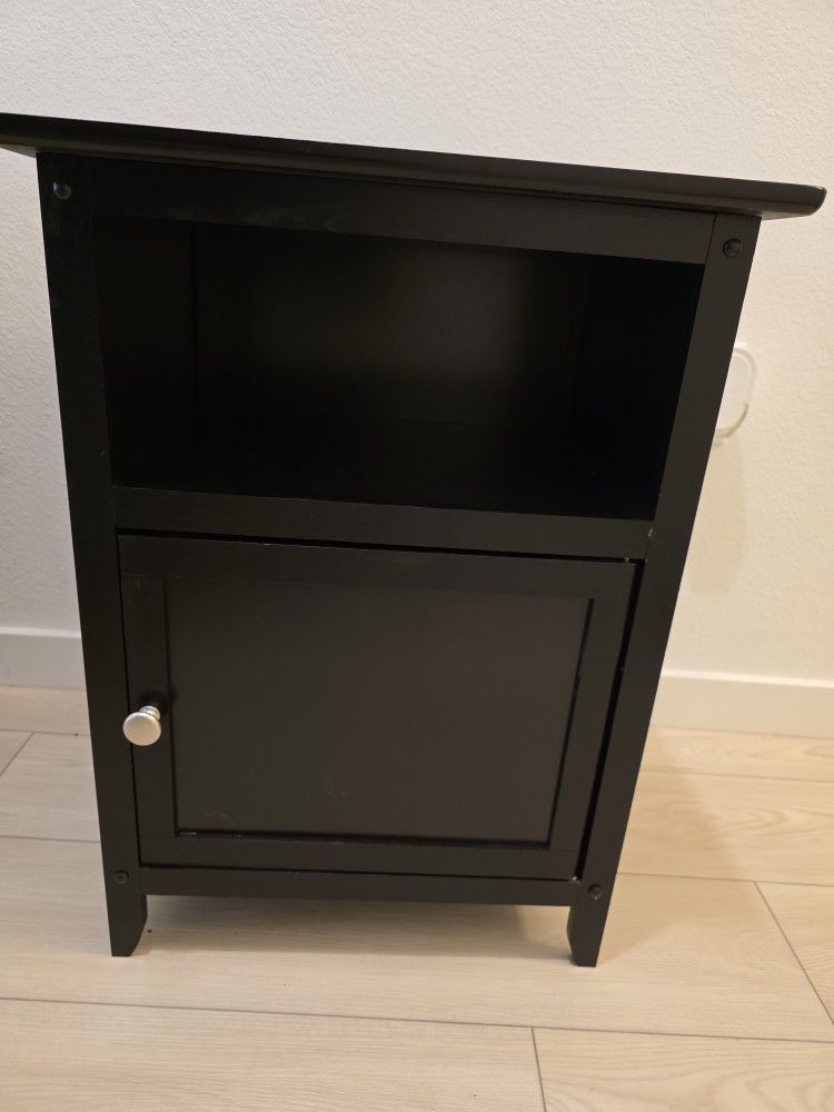 Black nightstand. Has one open shelf for easy access. Bottom cabinet with a door and silver knob for hidden storage. Great for bedroom or living room. Dimensions: 14.96"D x 18.9"W x 25"H