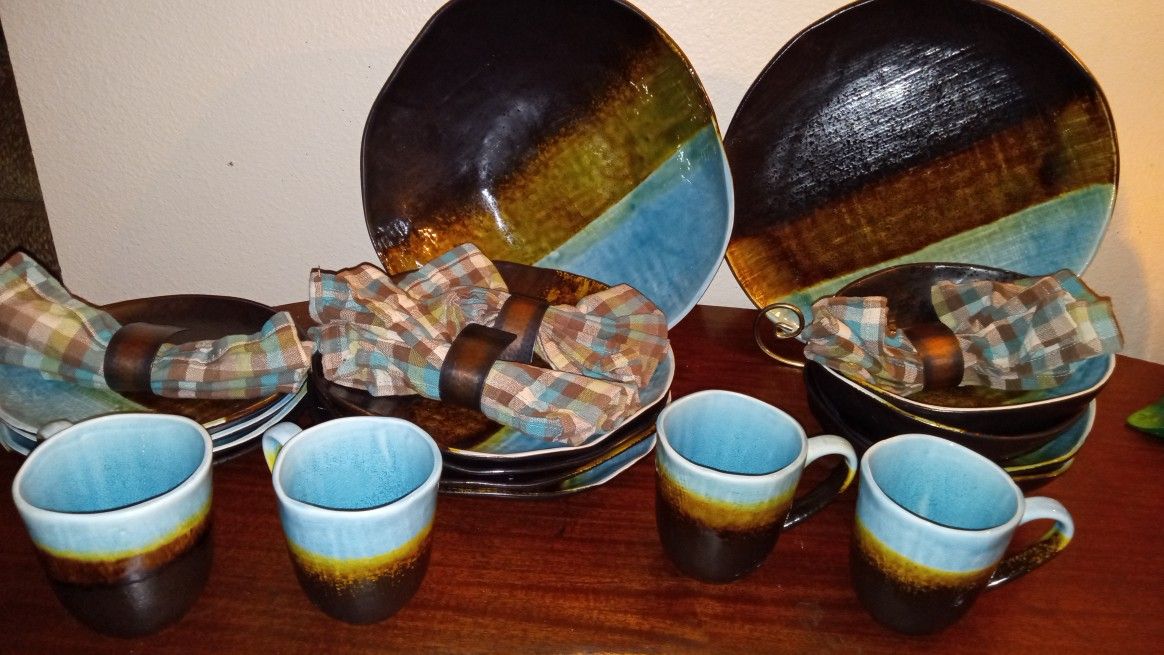 Complete set of dishes for four. Including napkins, napkin rings, large serving platter, large serving bowl, four plates, four mugs, and four salad plates. $50 for the complete set. No chips or cracks. Pick up in Woodland.