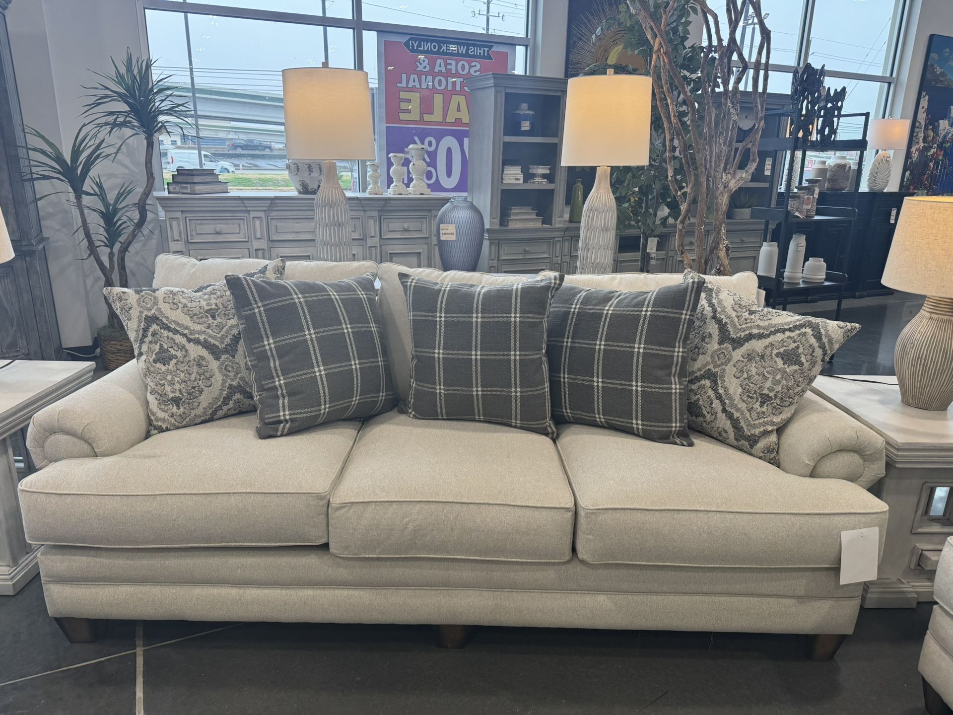 The Walden collection is a transitional collection upholstered in Casey Shell, a light beige polyester fabric. This collection features rolled arms and accent pillows in shades of gray. Meticulously crafted, the Walden provides unsurpassed comfort without sacrificing style. Made in the USA of domestic and imported materials. Color: Cover: Cosey Shell Front Pillow: To pis Onyx Bock Pillow: Wolden Smoke Features: Reversible seat and back cushions 100% WOW gel-blended foam Solid wooden legs Throw pillows included 100% Polyester I CC: W Dimensions: Sofa: 101"W x 45"D x 38"H