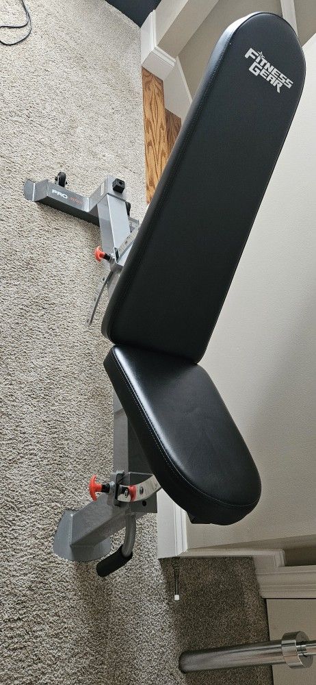 Originally 250. Heavy duty bench excellent condition FEATURES: 3 level adjustable utility bench Compatible with Fitness Gear Pro Half Rack Heavy-duty, durable steel for quality, long-lasting performance 8 adjustable backrest levels to customize workout between flat, decline and incline positions Quick 3 level adjustment seat system Comfortable, high-density foam with reinforced double-stitched seams stand up to wear and tear Wheels and handle allow for easy mobility and storage Pairs with Fitness Gear Pro Half Rack (sold separately) Great for extensive free weight exercises SPECS: 300lbs User Weight / 300lbs Additional Loaded Weight Assembled Dimensions: 52.9 ” L x 24.4” W x 17.7 H Package Dimensions: ?53" L x 17"W x 8" H Brand : Fitness Gear Country of Origin : Imported Style : STE00502 DSG Pro Tips